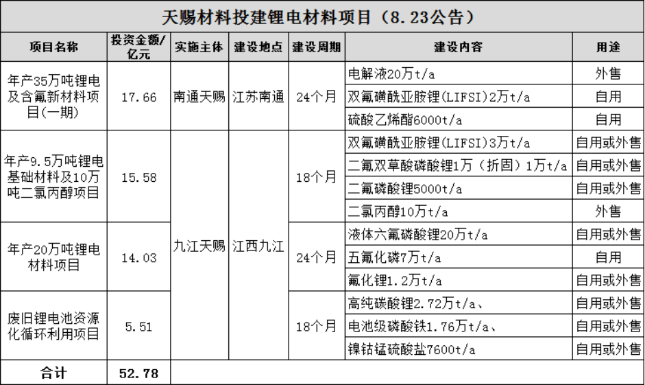 8月23日,天賜材料連發(fā)多則公告,加快電解液及其原材料產(chǎn)能建設進(jìn)程,強化電解液一體化戰略,投資總額達52.78億元。