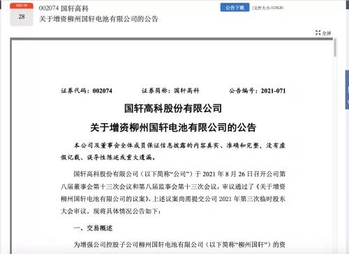 8 月 28 日消息 昨日,國軒高科發(fā)布公告稱(chēng),公司全資子公司合肥國軒電池有限公司(以下簡(jiǎn)稱(chēng)“國軒電池”)擬以自有和自籌資金不超過(guò)人民幣 2.60 億元投資建設國軒 1GWh 高性能電芯項目。