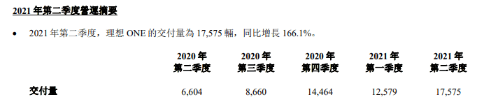 數據顯示,2021年第一季度理想ONE的交付量為12579輛,2021年第二季度其交付量為17575輛。