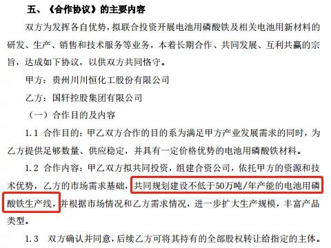 根據合作協(xié)議,川恒股份與國軒集團將共同投資,組建合資公司,依托川恒股份的資源和技術(shù)優(yōu)勢,國軒集團的市場(chǎng)需求基礎,共同規劃建設不低于50萬(wàn)噸/年產(chǎn)能的電池用磷酸鐵生產(chǎn)線(xiàn),并根據市場(chǎng)情況和國軒集團需求情況,進(jìn)一步擴大生產(chǎn)規模,豐富產(chǎn)品類(lèi)型。