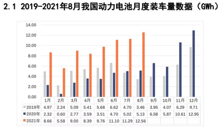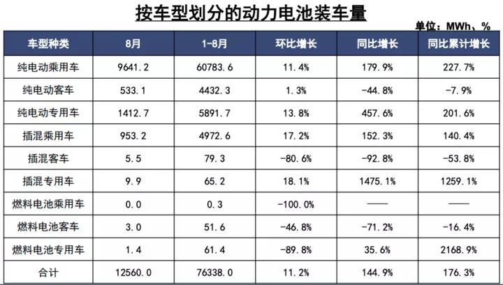 前8月,我國動(dòng)力電池裝車(chē)量累計76.3GWh,同比累計上升176.3%。其中三元電池裝車(chē)量累計40.9GWh,占總裝車(chē)量53.6%,同比累計上升111.2%;磷酸鐵鋰電池裝車(chē)量累計35.2GWh,占總裝車(chē)量46.2%,同比累計上升338.6%。