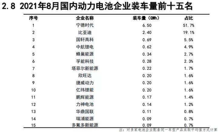 9月11日,中國汽車(chē)動(dòng)力電池產(chǎn)業(yè)創(chuàng )新聯(lián)盟發(fā)布2021年8月新能源汽車(chē)電池產(chǎn)銷(xiāo)量及裝車(chē)量數據。8月,寧德時(shí)代裝車(chē)量6.5GWh,市占率進(jìn)一步提升達51.7%,穩坐冠軍寶座。比亞迪裝車(chē)量1.9GWh穩居第二,國軒高科超越中航鋰電躋身第三,蜂巢能源超越億緯鋰能躋身第五。