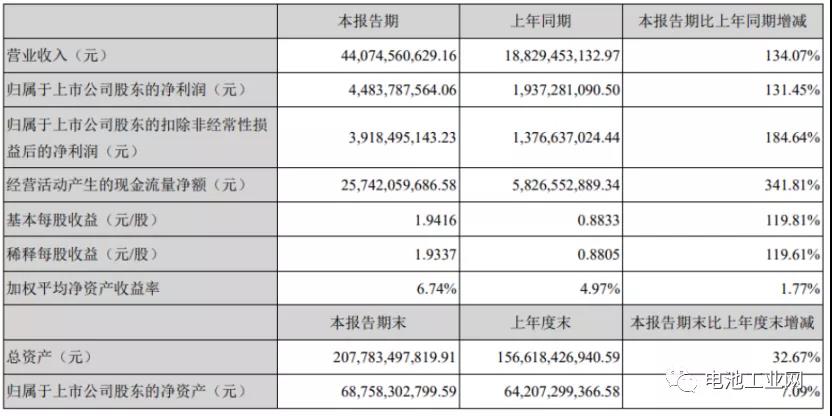 全球動(dòng)力電池市場(chǎng)上,寧德時(shí)代已經(jīng)坐上了頭把交椅。8月25日晚間,寧德時(shí)代發(fā)布2021年半年度報告,該公司上半年營(yíng)業(yè)收入為440.75億元,同比增長(cháng)134.07%。歸屬于上市公司股東的凈利潤為44.84億元,同比增長(cháng)131.45%。截止到26日,寧德時(shí)代成交達到45億,跌幅超1%,總市值為1.22萬(wàn)億。
