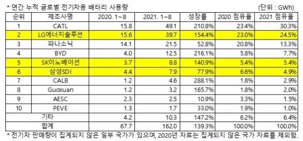 最新的2021年1-8月全球動(dòng)力電池裝車(chē)量排行榜上,SKI以3.7GWh的動(dòng)力電池裝車(chē)量位居第5位,在韓國市場(chǎng)則僅落后于LG新能源,排名第2。