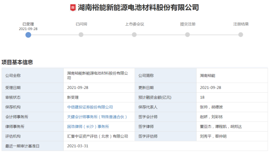 9月28日,湖南裕能新能源電池材料股份有限公司(下稱(chēng)“湖南裕能”)申報創(chuàng )業(yè)板IPO獲受理,保薦機構為中信建投證券。