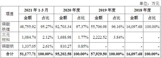 招股說(shuō)明書(shū)顯示,湖南裕能成立于2016年,是國內主要的鋰離子電池正極材料供應商,專(zhuān)注于鋰離子電池正極材料研發(fā)、生產(chǎn)和銷(xiāo)售。公司的主要產(chǎn)品包括磷酸鐵鋰、三元材料等鋰離子電池正極材料,目前以磷酸鐵鋰為主,占營(yíng)收比重超95%。