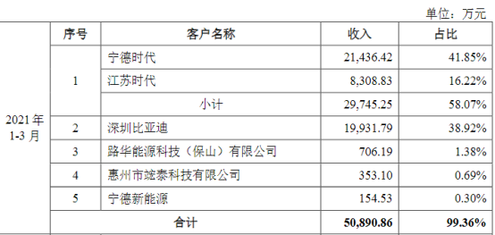 客戶(hù)方面,2018年至2021年第一季度,湖南裕能對前五大客戶(hù)的銷(xiāo)售收入,占整體銷(xiāo)售收入的比重均超過(guò)95%。其中,公司對寧德時(shí)代、比亞迪的合計銷(xiāo)售收入占比,分別達91.24%、93.56%、91.10%和96.99%,客戶(hù)集中度較高。