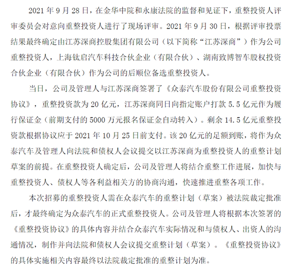 當日,公司及管理人與江蘇深商簽署了《眾泰汽車(chē)股份有限公司重整投資協(xié)議》,重整投資款為20億元,江蘇深商同日向指定賬戶(hù)打款5.5億元作為履行保證金(前期支付的5000萬(wàn)元報名保證金自動(dòng)轉入)。