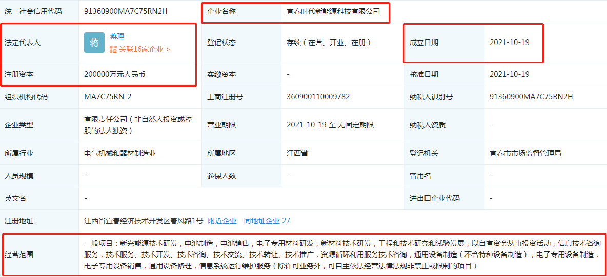 企查查資料顯示,宜春時(shí)代的法定代表人為蔣理,注冊資本20億元人民幣,經(jīng)營(yíng)范圍包括新興能源技術(shù)研發(fā),電池制造,電池銷(xiāo)售,電子專(zhuān)用材料研發(fā),新材料技術(shù)研發(fā)等。