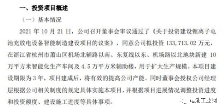 10月21日晚間,杭可科技發(fā)布公告,公司召開(kāi)董事會(huì )審議通過(guò)了《關(guān)于投資建設鋰離子電池充放電設備智能制造建設項目的議案》,同意公司擬投資13.37億元,在浙江省杭州市蕭山區機場(chǎng)北輔路以南、東復線(xiàn)以東、機場(chǎng)路以北地塊新建10萬(wàn)平方米智能化生產(chǎn)車(chē)間及4.5萬(wàn)平方米輔助樓,用于擴大生產(chǎn)規模。