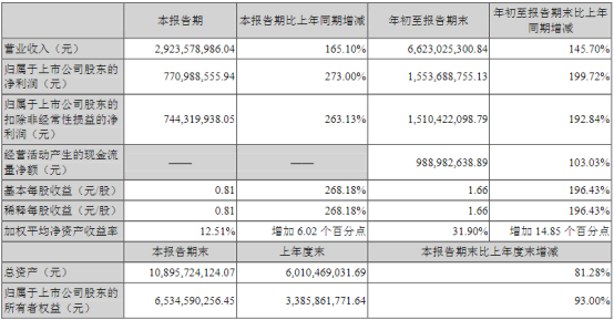 其中,第三季度,公司實(shí)現營(yíng)業(yè)收入29.24億元,同比增長(cháng)165.1%;實(shí)現歸屬于上市公司股東的凈利潤7.71億元,同比增長(cháng)273%。