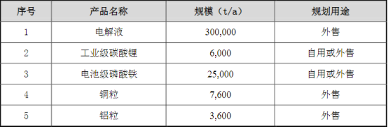 上述項目建成后,將形成電解液300000t/a,規劃用于外售;工業(yè)級碳酸鋰6000t/a、電池級磷酸鐵2500t/a,均為自用或外售;銅粒7600t/a、鋁粒3600t/a,計劃用于外售。