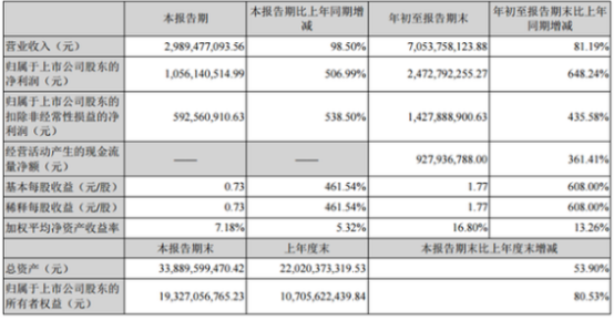 單季度來(lái)看,第三季度公司營(yíng)收加速上漲,實(shí)現營(yíng)業(yè)收入29.89億元,同比增長(cháng)98.50%;歸母凈利潤為10.56億元,同比增長(cháng)506.99%。
