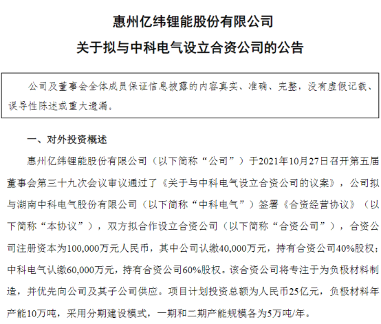 當日,億緯鋰能還同時(shí)公告,擬與中科電氣”簽署《合資經(jīng)營(yíng)協(xié)議》,雙方擬合作設立合資公司,合資公司注冊資本為10億元,其中公司認繳4億元,持有合資公司40%股權;中科電氣認繳6億元,持有合資公司60%股權。
