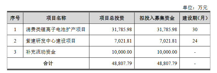 本次公司擬發(fā)行不超過(guò)1770萬(wàn)股流通股,占發(fā)行后總股本的比例不低于25%。擬募集4.88億元,主要用于消費類(lèi)鋰離子電池擴產(chǎn)項目、紫建研發(fā)中心建設項目以及補充流動(dòng)資金。