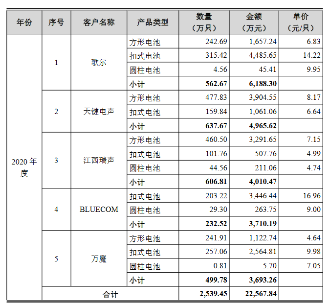 分應用領(lǐng)域來(lái)看,2020年藍牙耳機電池營(yíng)收5.82億元、占比92.6%,智能可穿戴設備電池營(yíng)收3542.1萬(wàn)元、占比5.64%,藍牙音箱電池占比0.61%,其他占比1.18%。2018-2020年公司藍牙耳機電池銷(xiāo)售收入分別為2.05億元、3.52億元和5.82億元。