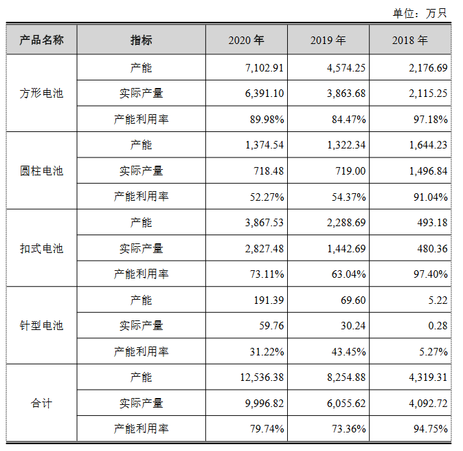 產(chǎn)能方面,紫建電子擁有重慶開(kāi)州、萬(wàn)州以及東莞三個(gè)廠(chǎng)區,2020年公司產(chǎn)能1.25億只,實(shí)際產(chǎn)量1億只,產(chǎn)能利用率79.7%,其中方形電池產(chǎn)量6391萬(wàn)只、扣式電池產(chǎn)量2827萬(wàn)只、圓柱電池產(chǎn)量718萬(wàn)只、針型電池產(chǎn)量60萬(wàn)只。