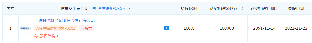 股東信息顯示,宜春時(shí)代由A股上市公司寧德時(shí)代(300750.SZ)100%持股。