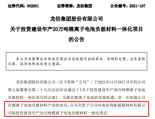 11月29日晚間,龍佰集團發(fā)布公告稱(chēng),公司全資子公司佰利新能源擬投資建設年產(chǎn)20萬(wàn)噸鋰離子電池負極材料一體化項目。項目總投資35億元,分三期建設,一期、二期分別建設年產(chǎn)5萬(wàn)噸鋰離子電池石墨負極材料生產(chǎn)線(xiàn),三期建設年產(chǎn)10萬(wàn)噸鋰離子電池石墨負極材料生產(chǎn)線(xiàn)。