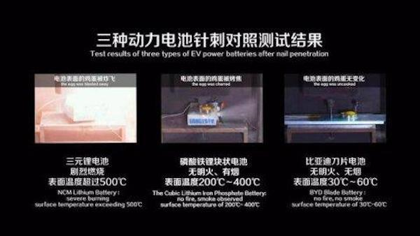 比亞迪于2020年正式推出磷酸鐵鋰刀片電池,伴隨著(zhù)當時(shí)的針刺對照實(shí)驗視頻,刀片電池一夜成名。