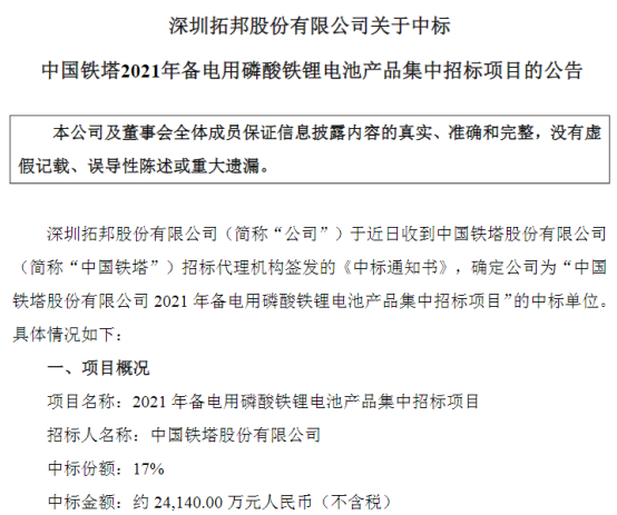 同日,拓邦股份還公告,公司于近日收到中國鐵塔股份有限公司(簡(jiǎn)稱(chēng)“中國鐵塔”)招標代理機構簽發(fā)的《中標通知書(shū)》,確定公司為“中國鐵塔股份有限公司2021年備電用磷酸鐵鋰電池產(chǎn)品集中招標項目”的中標單位。中標份額為17%,中標金額約2.41億元人民幣(不含稅)。