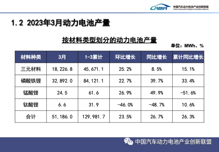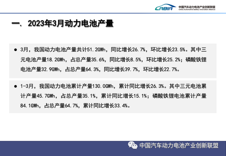 1-3月,中國動(dòng)力電池累計產(chǎn)量130.0GWh,累計同比增長(cháng)26.3%。其中三元電池累計產(chǎn)量45.7GWh,占總產(chǎn)量35.1%,累計同比增長(cháng)15.1%;磷酸鐵鋰電池累計產(chǎn)量84.1GWh,占總產(chǎn)量64.7%,累計同比增長(cháng)33.4%。