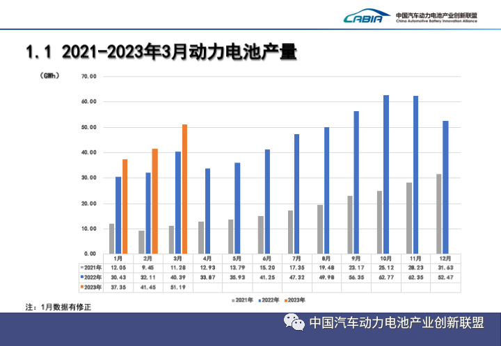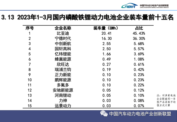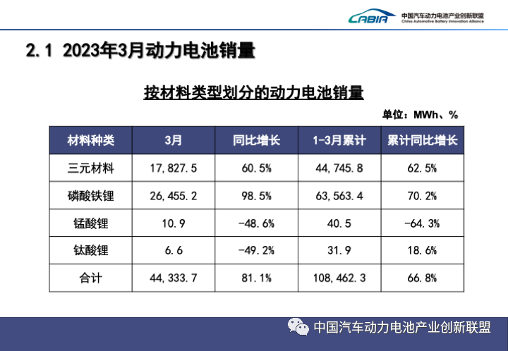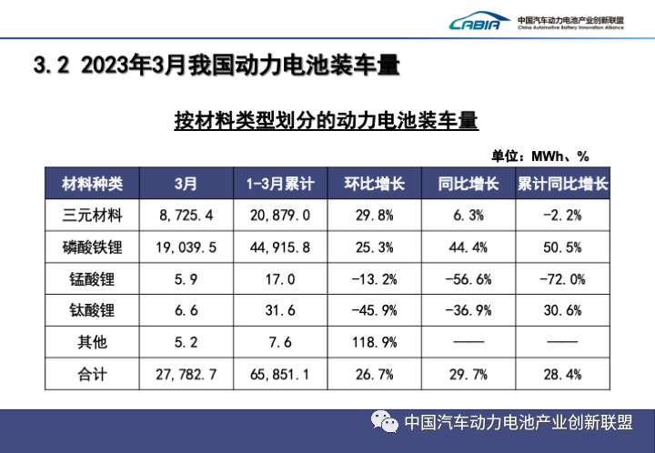 1-3月,中國動(dòng)力電池累計裝車(chē)量65.9GWh, 累計同比增長(cháng)28.4%。其中三元電池累計裝車(chē)量20.9GWh,占總裝車(chē)量31.7%,累計同比下降2.2%;磷酸鐵鋰電池累計裝車(chē)量44.9GWh,占總裝車(chē)量68.2%,累計同比增長(cháng)50.5%。