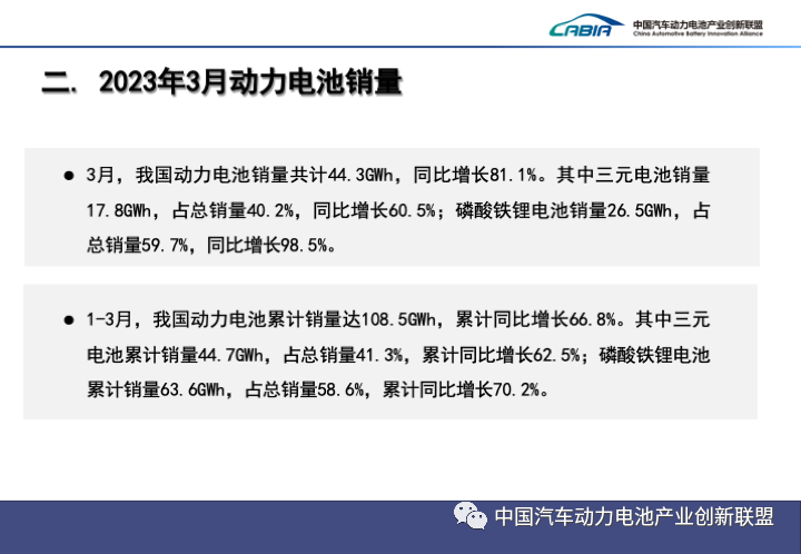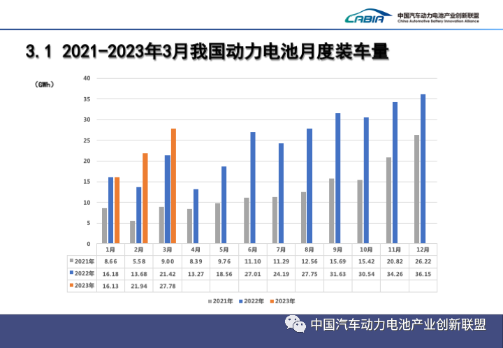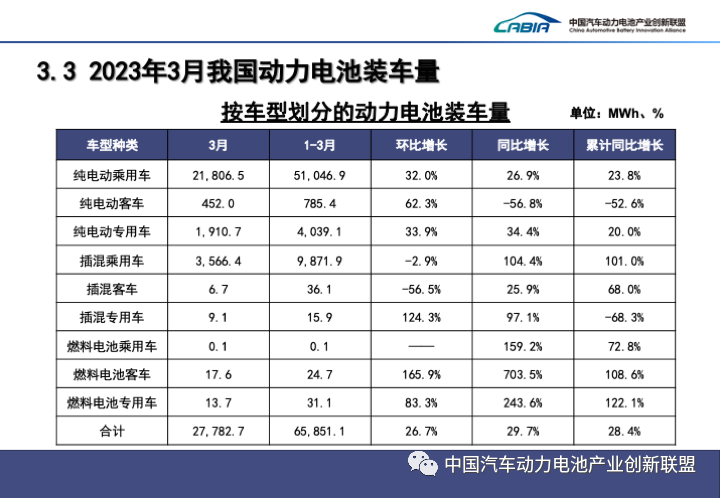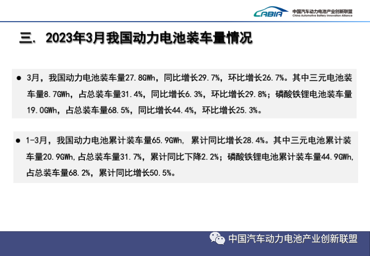 3月,中國動(dòng)力電池裝車(chē)量27.8GWh,同比增長(cháng)29.7%,環(huán)比增長(cháng)26.7%。其中三元電池裝車(chē)量8.7GWh,占總裝車(chē)量31.4%,同比增長(cháng)6.3%,環(huán)比增長(cháng)29.8%;磷酸鐵鋰電池裝車(chē)量19.0GWh,占總裝車(chē)量68.5%,同比增長(cháng)44.4%,環(huán)比增長(cháng)25.3%。