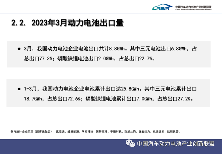 3月,中國動(dòng)力電池企業(yè)電池出口共計8.8GWh。其中三元電池出口6.8GWh,占總出口77.3%;磷酸鐵鋰電池出口2.0GWh,占總出口22.7%。
