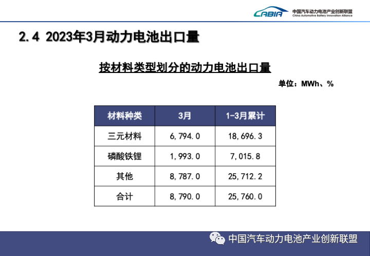 1-3月,中國動(dòng)力電池企業(yè)電池累計出口達25.8GWh。其中三元電池累計出口18.7GWh,占總出口72.6%;磷酸鐵鋰電池累計出口7.0GWh,占總出口27.2%。