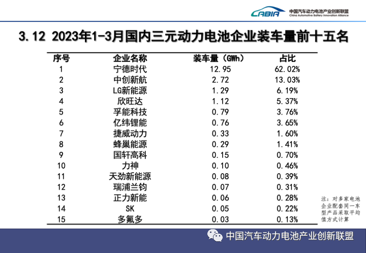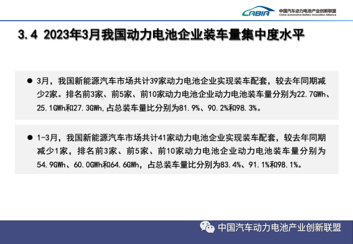 3月,中國新能源汽車(chē)市場(chǎng)共計39家動(dòng)力電池企業(yè)實(shí)現裝車(chē)配套,較去年同期減少2家。排名前3家、前5家、前10家動(dòng)力電池企業(yè)動(dòng)力電池裝車(chē)量分別為22.7GWh、25.1GWh和27.3GWh,占總裝車(chē)量比分別為81.9%、90.2%和98.3%。