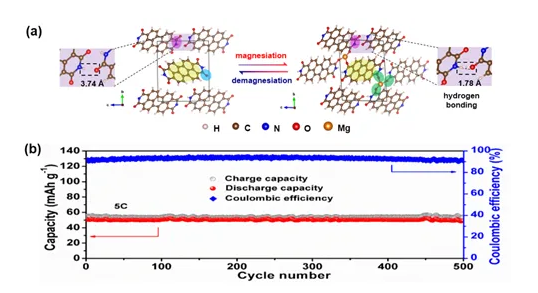 圖(a)PTCDI有機負極的嵌鎂/脫鎂機理圖。(b)基于PTCDI負極和EG正極的Mg-DIB在5C下的長(cháng)循環(huán)性能圖