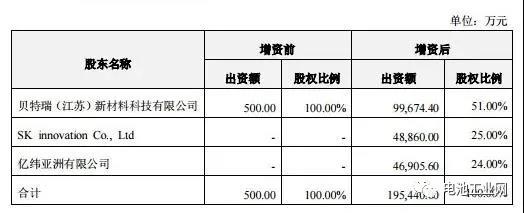 其中,貝特瑞以現金出資約9.97億元,占合資公司注冊資本的51%;SKI以現金出資4.89億元,占合資公司注冊資本的25%;億緯亞洲以現金出資4.69億元,占合資公司注冊資本的24%。