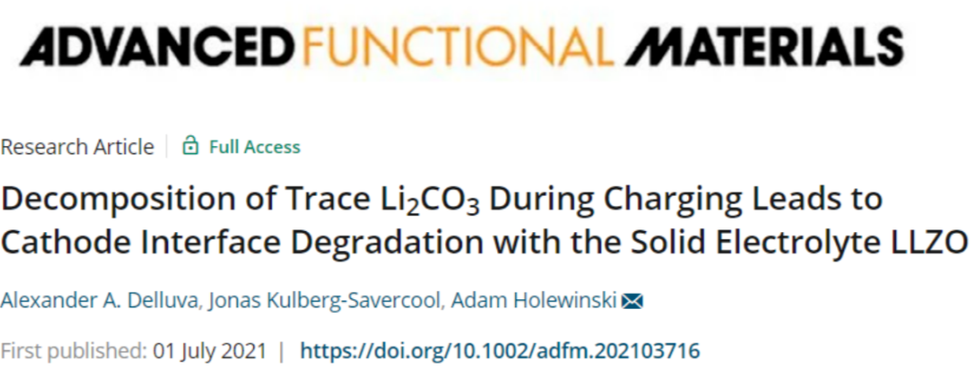 Delluva, A. A., Kulberg-Savercool, J., Holewinski, A., Decomposition of Trace Li2CO3 During Charging Leads to Cathode Interface Degradation with the Solid Electrolyte LLZO. Adv. Funct. Mater. 2021, 2103716.