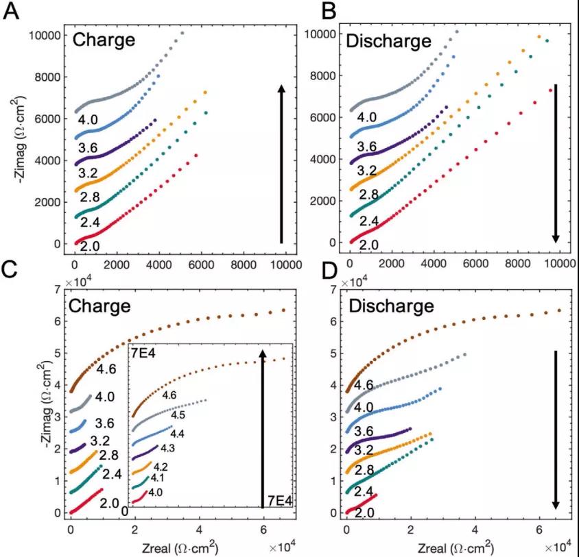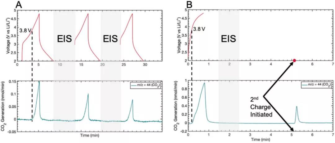 圖2A、B為在4V和2V的初始充電和放電截止值,以400 mV間隔采集的EIS圖譜。當保持在4 V以下時(shí),EIS響應的主要特征與在任一循環(huán)方向上的各個(gè)電壓下保持一致的幅度和形狀,但與擴散機制相關(guān)的電阻略有增加。相比之下,當截止電壓增加時(shí),與陰極界面電荷轉移相關(guān)的中頻阻抗電弧增長(cháng)到更大的電阻。圖2C、D顯示,在4.6 V的高充電截止電壓和放電至2 V之間的PR-EIS光譜。EIS的明顯變化在4.3-4.4 V左右表現出來(lái)。雖然開(kāi)始電壓相對較高,但可以注意到CO2的釋放,且在高電壓下釋放更明顯。