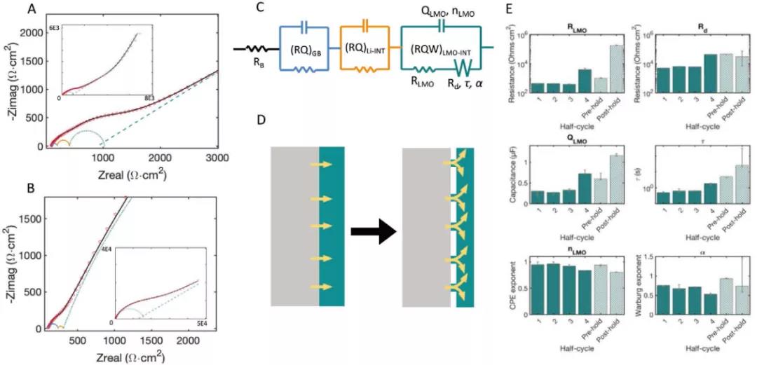 Li2CO3分解引起的物理化學(xué)變化可以在等效電路(圖 3C)中進(jìn)一步比較。圖 3E顯示,高壓充電(第 4 個(gè)半周期)后的擬合顯示出陰極界面電。≧LMO)的界面電阻大幅增加,相關(guān)的恒定相位元件(CPE)指數的也顯著(zhù)下降(nLMO)。除了表征陰極界面本身的參數的變化之外,LMO內擴散相關(guān)的時(shí)間常數也逐漸上升。時(shí)間常數與擴散系數和特征路徑長(cháng)度有關(guān)。當施加高電壓后,特征路徑(τd)的上升可歸因于Li在較少點(diǎn)進(jìn)入薄膜的平均擴散路徑長(cháng)度增加(圖 3D)。由于與分層區域相比,電解質(zhì)顆粒的縱橫比大得多(即,電解質(zhì)中鋰的平均路徑長(cháng)度在分層后略有變化),因此在與LLZO相關(guān)的電阻中,沒(méi)有看到類(lèi)似的增加。