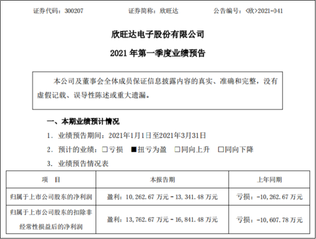 得益于國內新冠疫情肺炎得到有效管控,欣旺達經(jīng)營(yíng)計劃有序開(kāi)展,隨著(zhù)市場(chǎng)營(yíng)銷(xiāo)力度的加大,公司2021年第一季度主營(yíng)業(yè)務(wù)收入穩步增長(cháng),盈利能力提高導致業(yè)績(jì)相應增長(cháng)。公告顯示,公司預計2021年1-3月歸屬上市公司股東的凈利潤1.03億至1.33億,同比變動(dòng)200.00%至230.00%,一季度成功實(shí)現扭虧為盈。