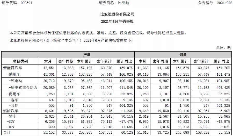 今年上半年比亞迪新能源汽車(chē)累計銷(xiāo)售15.46萬(wàn)輛,同比增長(cháng)154.76%;新能源汽車(chē)動(dòng)力電池及儲能電池裝機總量約為12.707GWh。