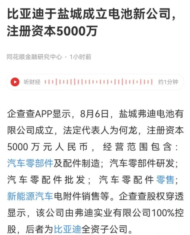 啟信寶顯示,8月6日,鹽城弗迪電池有限公司(以下弗迪電池)成立,法定代表人為何龍,注冊資本5000萬(wàn)元人民幣。弗迪電池的經(jīng)營(yíng)范圍包含:電池制造、電池銷(xiāo)售、汽車(chē)零部件及配件制造、汽車(chē)零部件批發(fā)、新能源汽車(chē)電附件銷(xiāo)售等。