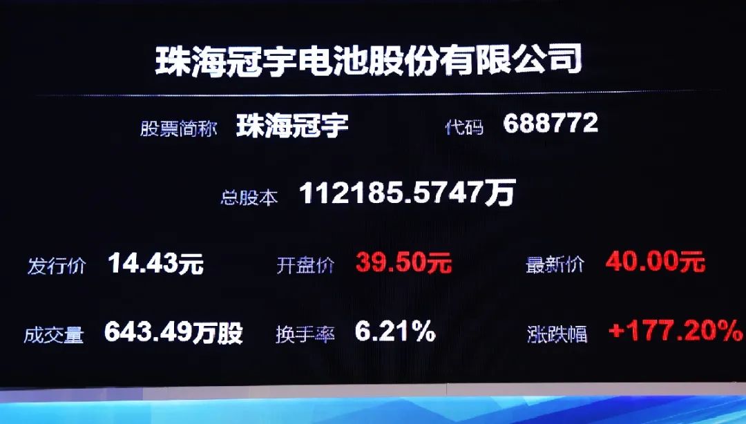 珠海冠宇股票首發(fā)15571.36萬(wàn)股,首日開(kāi)盤(pán)價(jià)為39.50元/股,漲幅高達173.74%。