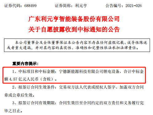 10月25日,科創(chuàng )板鋰電設備企業(yè)利元亨(688499.SH)發(fā)布《關(guān)于自愿披露收到中標通知的公告》稱(chēng),公司于10月22日收到寧德新能源科技有限公司(簡(jiǎn)稱(chēng)“ATL”)通過(guò)電子郵件發(fā)送的中標通知,合計中標鋰電設備4.57億元人民幣(含稅)。