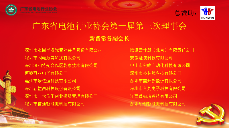 全體理事同意深圳市海目星激光智能裝備股份有限公司等16家企業(yè)成為廣東省電池行業(yè)協(xié)會(huì )常務(wù)副會(huì )長(cháng)單位。