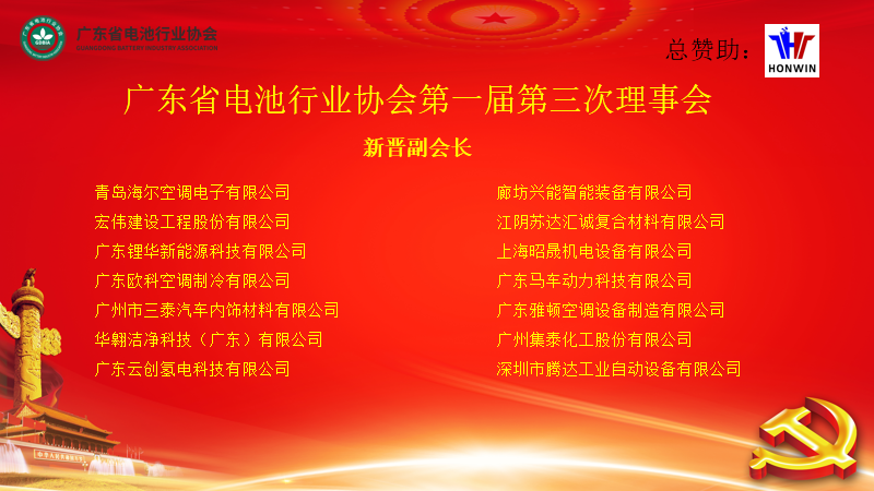 全體理事同意青島海爾空調電子有限公司等14家企業(yè)成為廣東省電池行業(yè)協(xié)會(huì )副會(huì )長(cháng)單位。