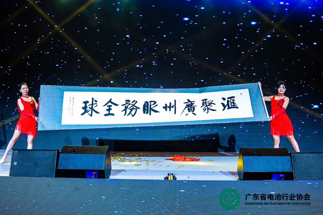 廣東省電池行業(yè)協(xié)會(huì )創(chuàng )會(huì )會(huì )長(cháng)趙國強、世界電池產(chǎn)業(yè)博覽會(huì )主席王照云分別接旗。