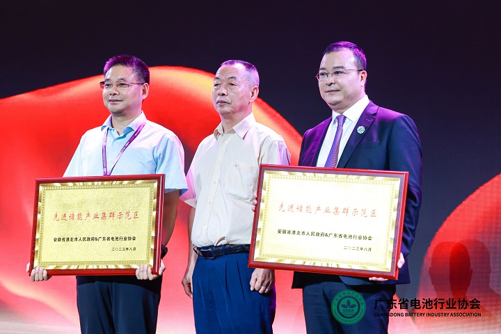 廣東省電池行業(yè)協(xié)會(huì )四周年慶典現場(chǎng)舉行了先進(jìn)儲能產(chǎn)業(yè)集群示范區授牌儀式;淮北市副市長(cháng)黃韡和唐長(cháng)江秘書(shū)長(cháng)鄭重接牌。