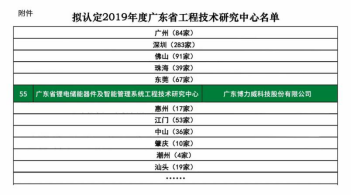 8、2月18日,廣東省科學(xué)技術(shù)廳公示了2019年廣東省工程技術(shù)研究中心名單,根據專(zhuān)家評議結果,我會(huì )常務(wù)副會(huì )長(cháng)單位——廣東博力威科技股份有限公司位列其中。依托廣東博力威科技股份有限公司建設的“廣東省鋰電儲能器件及智能管理系統工程技術(shù)研究中心”,被廣東省科學(xué)技術(shù)廳擬認定為2019年度廣東省工程技術(shù)研究中心。