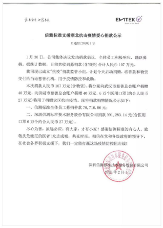 1月30日,深圳市信測標準技術(shù)服務(wù)股份有限公司向疫情嚴重地區捐贈107萬(wàn)元(含物資),其中向武漢市慈善總會(huì )賬戶(hù)捐贈40萬(wàn)元,向洪湖市慈善總會(huì )捐贈40萬(wàn)元,6萬(wàn)個(gè)醫用口罩(約合人民幣27萬(wàn)元)用于災區抗擊疫情。