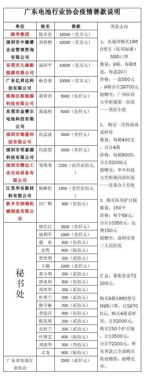 廣東省電池協(xié)會(huì )秘書(shū)處工作人員和愛(ài)心企業(yè)家共同為抗擊疫情捐款,并購買(mǎi)防疫抗疫物資,捐贈到抗疫一線(xiàn)。以下為捐贈詳情: