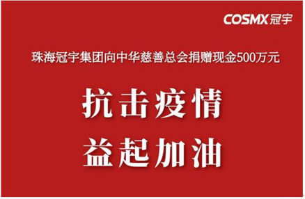 1月28日,珠海冠宇集團通過(guò)中華慈善總會(huì )捐款現金500萬(wàn)元,全部用于一線(xiàn)抗擊和防治新型冠狀病毒疫情工作。