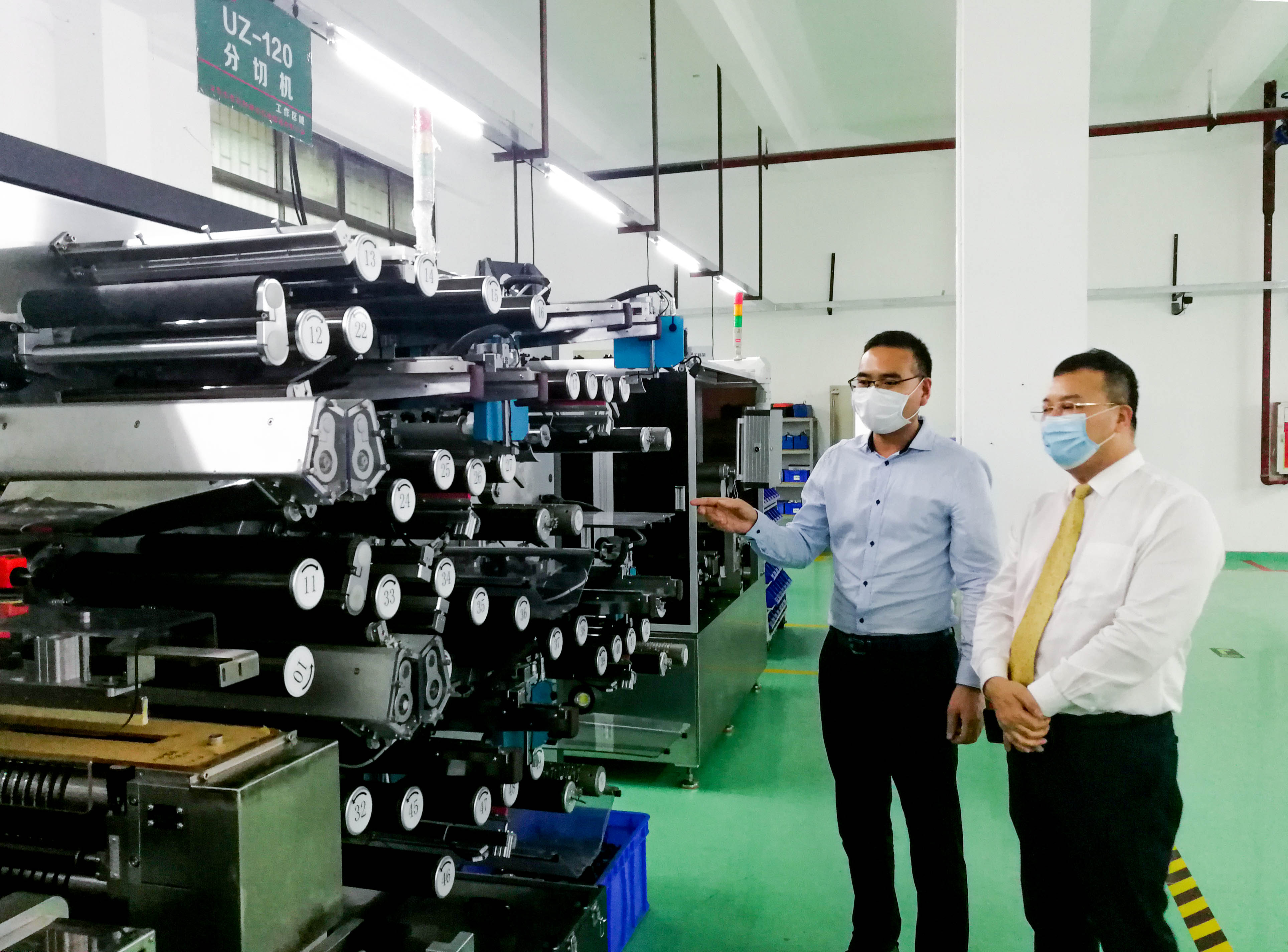 唐秘書(shū)長(cháng)一行在張前龍董事長(cháng)的陪同下參觀(guān)了友利特的生產(chǎn)車(chē)間,張前龍董事長(cháng)重點(diǎn)介紹了UZ-350CCD型扣式分切機最新的研發(fā)成果。